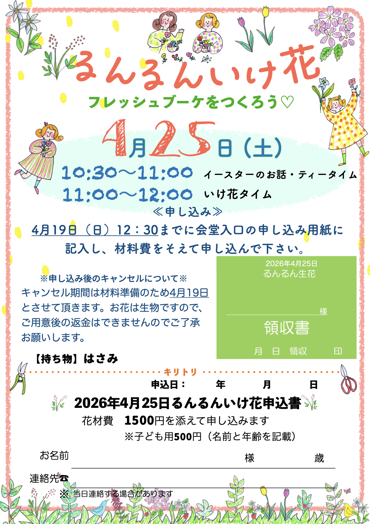 | お知らせ | ![]() ![]() 「るんるん生け花」 ~フレッシュブーケをつくろう♡~ 4月25日(土) 場所:清水ヶ丘教会付属白百合光の子幼稚園舎(礼拝堂横の坂をのぼったところにございます) 10:30~11:00 イースターのお話、ティータイム 11:00~12:00 いけ花タイム 材料費:大人 1500円(子ども 500円) ※ハサミをご持参ください 〆切4月19日(日) |