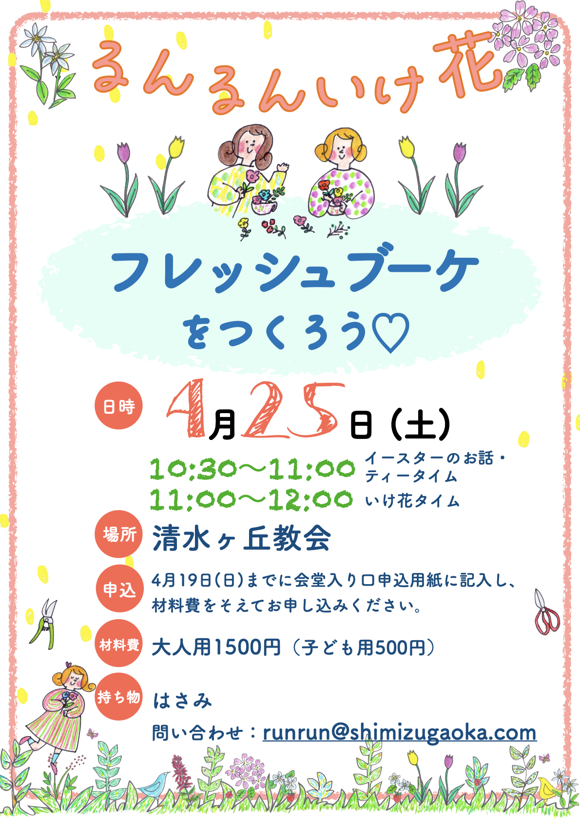 | 2025/12/5 | ![]() 《るんるんいけ花》 「フレッシュリースをつくろう♡」 12月13日(土)10:30~12:30 場所:清水ヶ丘教会 費用:2,000円(小学生500円・未就園児無料) 持ち物:はさみ・軍手 問い合わせ:runrun@shimizugaoka.com |