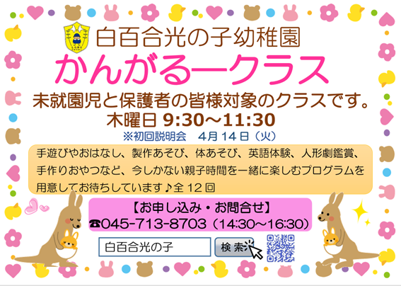 | お知らせ | ![]() ![]() 「るんるん生け花」 ~フレッシュブーケをつくろう♡~ 4月25日(土) 場所:清水ヶ丘教会付属白百合光の子幼稚園舎(礼拝堂横の坂をのぼったところにございます) 10:30~11:00 イースターのお話、ティータイム 11:00~12:00 いけ花タイム 材料費:大人 1500円(子ども 500円) ※ハサミをご持参ください 〆切4月19日(日) |